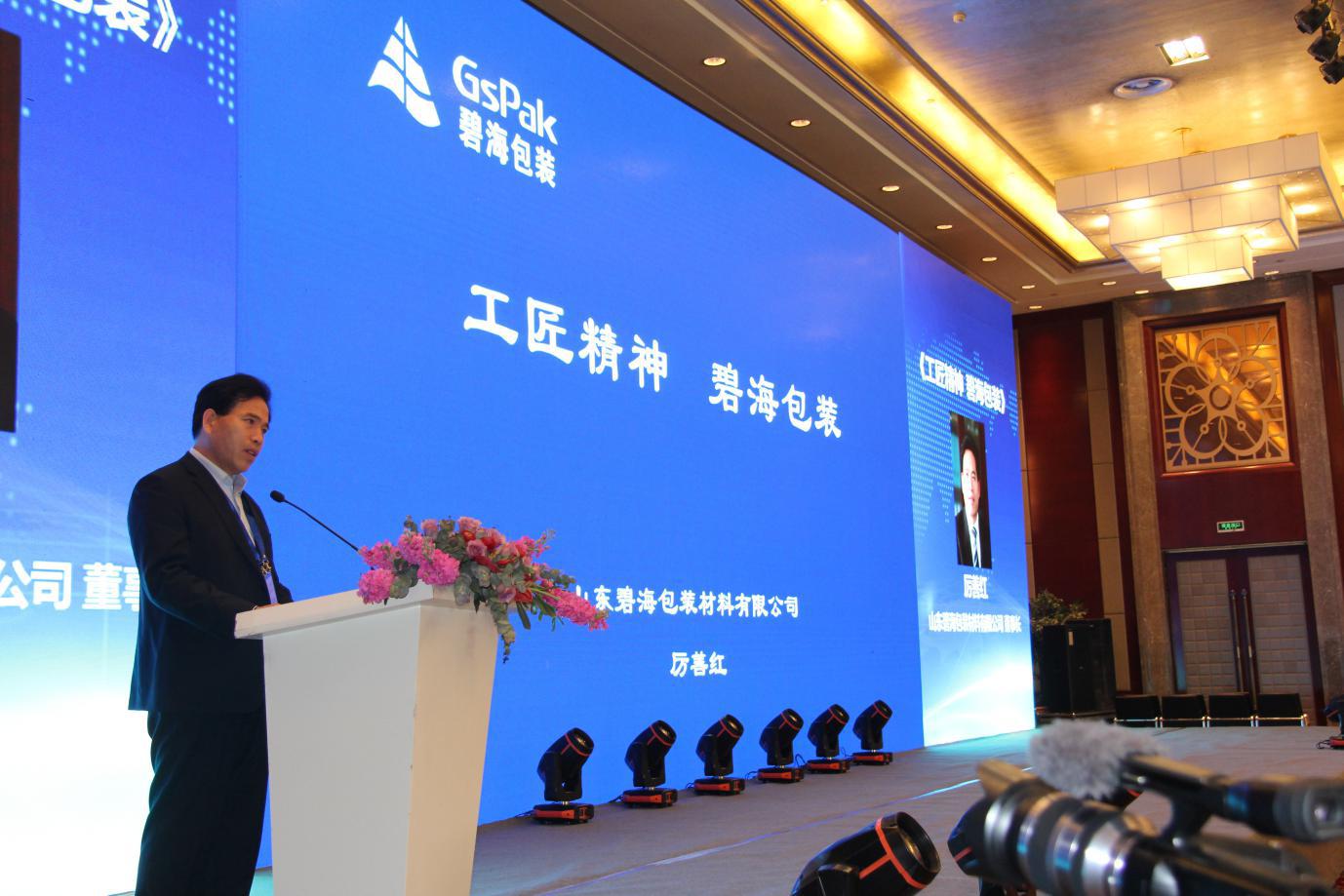 山東碧海包裝材料有限公司董事長(zhǎng)厲善紅在第七屆亞洲食品裝備論壇暨中國(guó)食品和包裝機(jī)械工業(yè)協(xié)會(huì)第二十七屆年會(huì)上做題為《工匠精神 碧海包裝》的發(fā)言